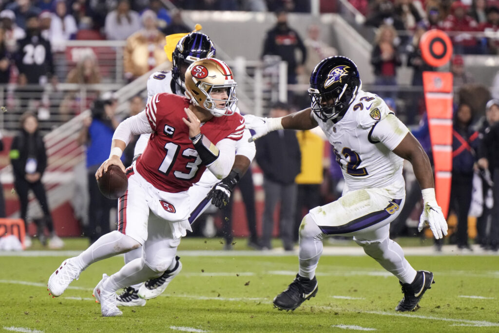 SANTA CLARA, CALIFORNIA – DECEMBER 25: Brock Purdy #13 of the San Francisco 49ers attempts a pass while pressured by Justin Madubuike #92 and Odafe Oweh #99 of the Baltimore Ravens during the second quarter at Levi’s Stadium on December 25, 2023 in Santa Clara, California. Although Brock Purdy isn’t a two-time MVP, local Bay area radio host would choose him over Lamar Jackson.