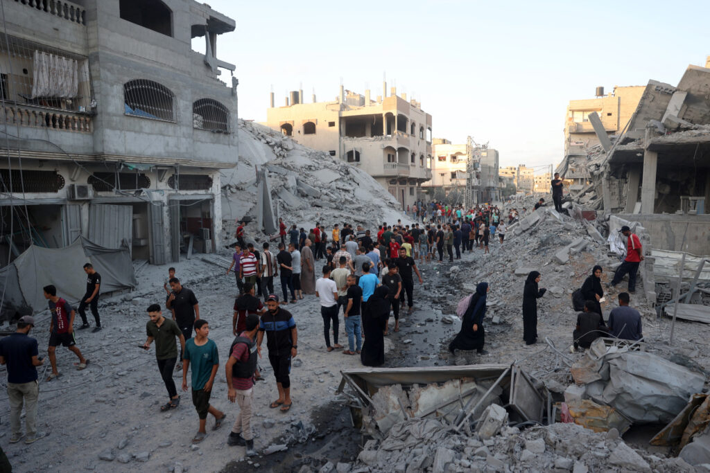 Palestinians gather to check a building shortly after it was levelled by Israeli bombing in the Nuseirat refugee camp in the central Gaza Strip on August 22, 2024, as the conflict between Israel and the Hamas militant group continues. On Friday, a U.N. official said that 90 percent of Gaza’s residents have been displaced amid Israel’s ongoing evacuation orders during the war.