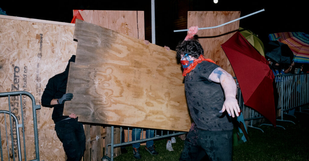 One of the counterprotesters, Liel Asherian, was seen on video footage kicking at the encampment’s plywood barrier, pulling boards to the ground and slamming a tennis racket against the wood that remained He said he had gone that night to see the encampment on his own, though he later acknowledged that a friend of his was also pictured at the scene. In an interview, he said he was not part of any group and had not intended to participate in a conflict.