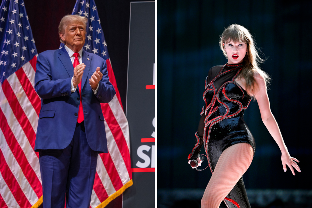 Right, Republican presidential nominee former President Donald Trump arrives to speak at a campaign event at Harrah’s Cherokee Center on August 14, 2024, in Asheville, North Carolina. Left, Taylor Swift performs onstage during “Taylor Swift | The Eras Tour” at Wembley Stadium on August 15, 2024, in London, England.
