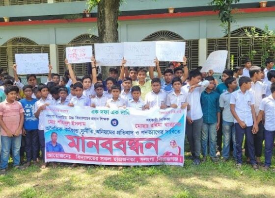 The students of Salanga Islamia High School in Sirajganj have been forming human chains for the second day against various…