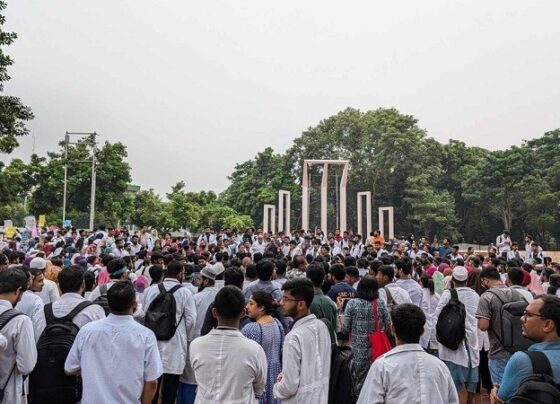 Doctors are gathering at Central Shaheed Minar as part of the 'March to BMDC' programme, protesting the consideration of medical…