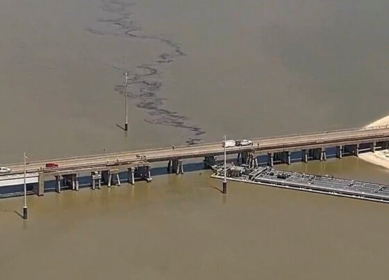 A barge struck a causeway connecting Galveston, Texas, to a small island on Wednesday morning, sending debris and oil into…