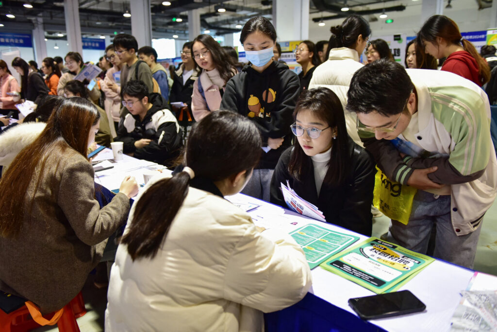 University students attend a job fair in Fuyang, in eastern China’s Anhui province on March 24, 2024. China’s youth unemployment figure for July was 17.1 percent, the highest so far this year.