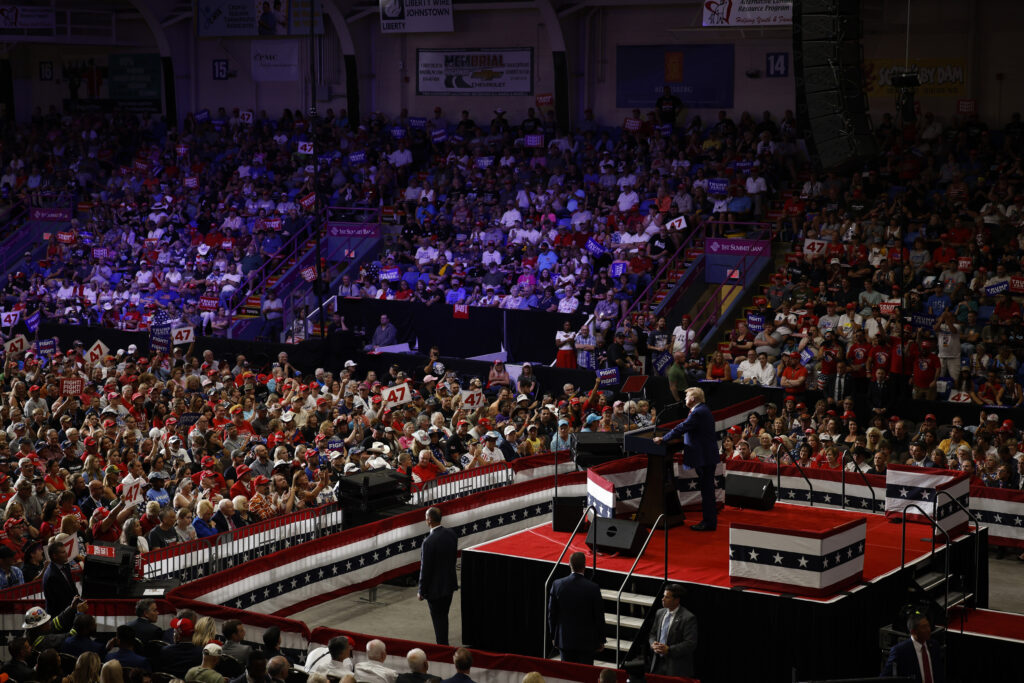 Republican presidential nominee, former U.S. President Donald Trump speaks during a campaign rally in the 1st Summit Arena at the Cambria County War Memorial on August 30, 2024 in Johnstown, Pennsylvania.