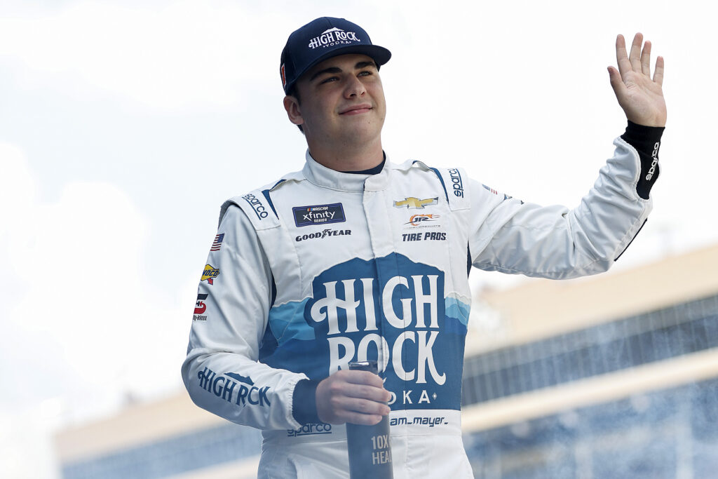 Sam Mayer, driver of the #1 High Rock Vodka Chevrolet, waves to fans as he walks onstage during driver intros prior to the NASCAR Xfinity Series Focused Health 250 at Atlanta Motor Speedway on September 07, 2024 in Hampton, Georgia. Sam Mayer’s car was left in flames during the Xfinity Series race in Atlanta.