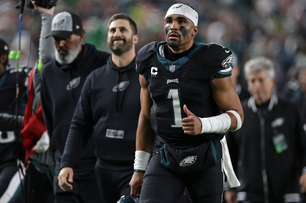Philadelphia Eagles head coach Nick Sirianni and Jalen Hurts #1 of the Philadelphia Eagles run off the field against the New York Giants at Lincoln Financial Field on December 25, 2023 in Philadelphia, Pennsylvania. McNabb…