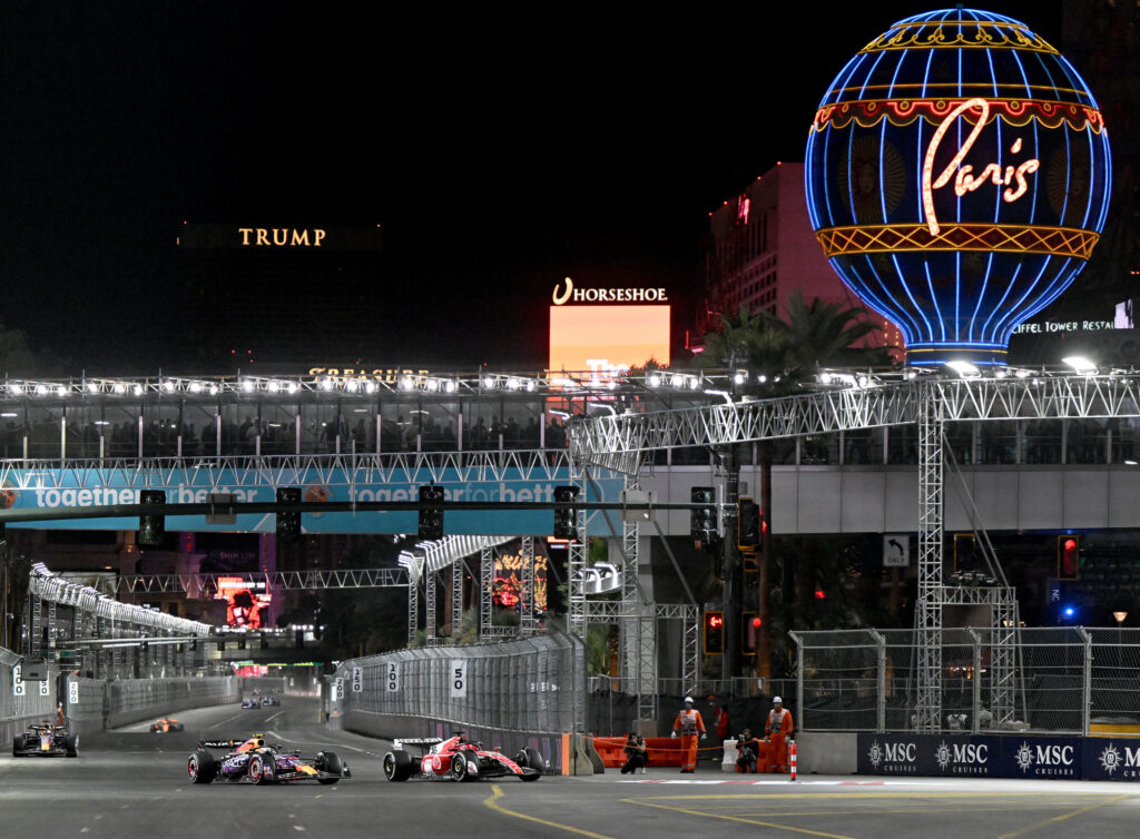 Charles Leclerc, right, passes Sergio Perez, left, for the race lead as they make the turn off of the Las Vegas Strip during the inaugural Formula 1 Las Vegas Grand Prix in Las Vegas, NV on Saturday, Nov. 18, 2023. Mario Andretti believes the 2023 Las Vegas GP was a huge success.
