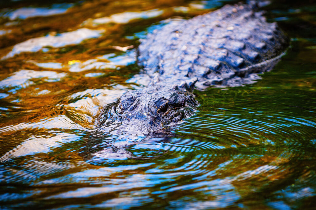Alligator hiding in the waters of the Everglades region of Florida. Alligators are found in all 67 of Florida’s counties and they’ve inhabited the state’s marshes, swamps, rivers and lakes for many centuries.