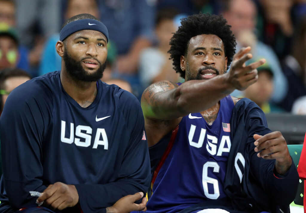 DeAndre Jordan #6 of United States and Demarcus Cousins #12 lookon during the Menβs Preliminary Round Group A between Australia and the United States on Day 5 of the Rio 2016 Olympic Games at Carioca Arena 1 on August 10, 2016 in Rio de Janeiro, Brazil. Cousins will take his talents to China.