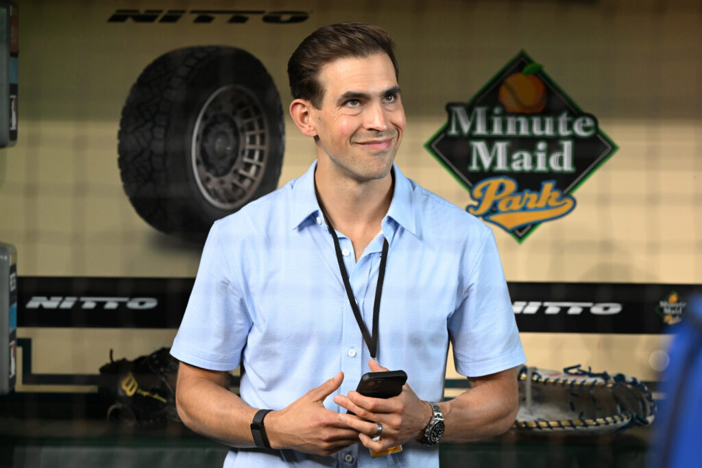 HOUSTON, TEXAS – JULY 27: Broadcaster Joe Davis of Dodgers TV stands in the dugout prior to the game against the Houston Astros at Minute Maid Park on July 27, 2024 in Houston, Texas. Davis…