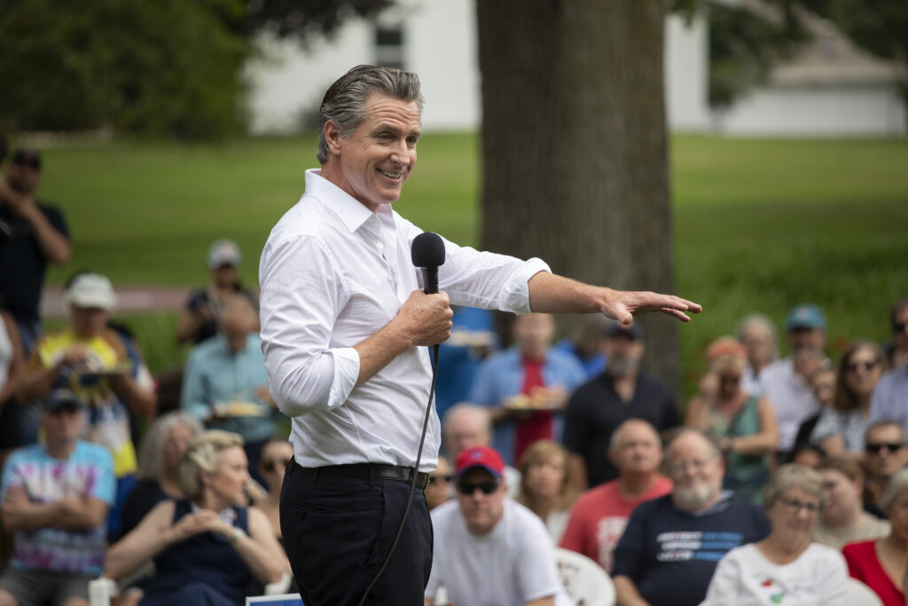 California Governor Gavin Newsom campaigns for President Joe Biden at the Van Buren County Democratic Party’s “BBQ for Biden-Harris” event on July 4 in South Haven, Michigan. Newsom vetoed a bill on Friday that would have expanded California’s first-time home-buying loan program to include undocumented immigrants.