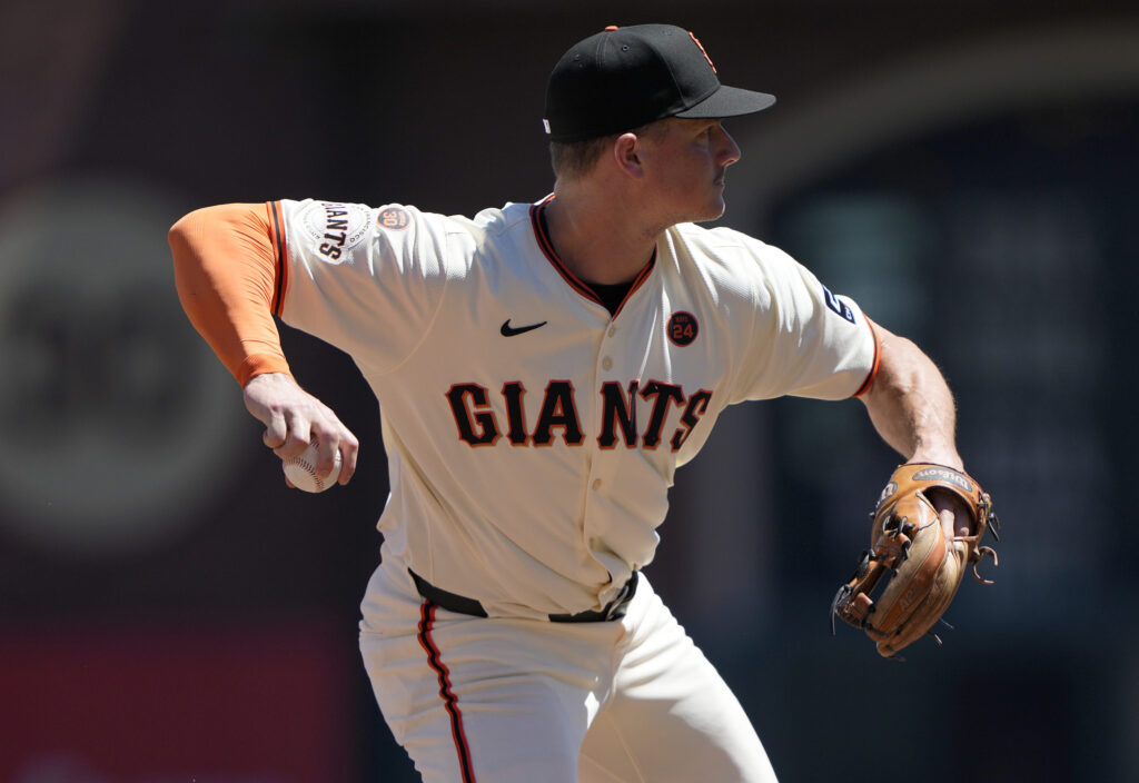 SAN FRANCISCO, CALIFORNIA – AUGUST 15: Matt Chapman #26 of the San Francisco Giants throws to first base throwing out Travis d’Arnaud #16 of the Atlanta Braves in the top of the fifth inning at Oracle Park on August 15, 2024 in San Francisco, California. (