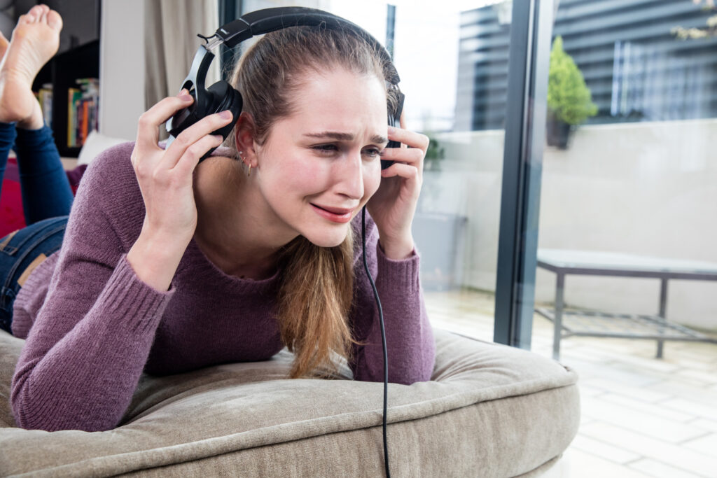 A woman removes her headphones and cries. Internet viewers have been grossed out by one woman’s discovery in her headphones.