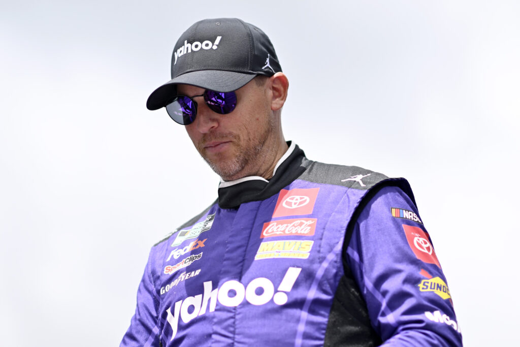 Denny Hamlin, driver of the #11 Yahoo! Toyota, walks onstage during driver intros prior to the NASCAR Cup Series FireKeepers Casino 400 at Michigan International Speedway on August 18, 2024 in Brooklyn, Michigan. Denny Hamlin is handed a huge penalty ahead of Daytona.