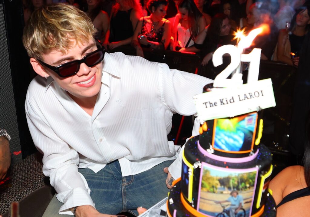 The packed crowd later joined in singing “Happy Birthday” to LAROI while confetti printed with his face fell to the floor of the venue. Large LED screens flashing birthday wishes, oversized childhood photos of LAROI, and a three-tiered cake topped with silver “21” numbers and album cover designs also added to the celebratory night.