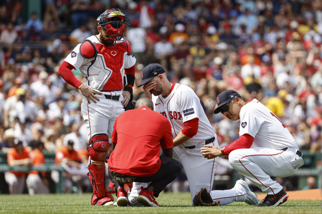 As catcher Connor Wong #12 of the Boston Red Sox and Manager Alex Cora #13, right, wait, a trainer looks at the leg of starting pitcher James Paxton #65 after he injured himself running to cover first base during the first inning against the Houston Astros at Fenway Park on August 11, 2024 in Boston, Massachusetts. Paxton was recently assigned to the 60-day IL, likley ending his 2024 season.