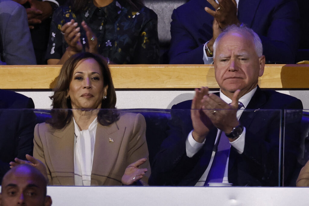 US Vice President and 2024 Democratic presidential candidate Kamala Harris (L) and Minnesota Governor and 2024 Democratic vice presidential candidate Tim Walz attend the first day of the Democratic National Convention (DNC) at the United Center in Chicago, Illinois, on August 19, 2024. Vice President Kamala Harris will formally accept the party’s nomination for president at the DNC which runs from August 19-22 in Chicago.