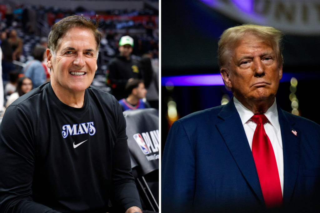 Mark Cuban (L) attends the Round 1 Game 2 of the 2024 NBA Playoffs between the Los Angeles Clippers and the Dallas Mavericks game on April 23, 2024 in Los Angeles, California. (R) Donald Trump…