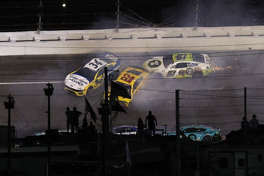 Michael McDowell, driver of the #34 Long John Silver’s Ford, Joey Logano, driver of the #22 Shell Pennzoil Ford, and Justin Haley, driver of the #51 Beef a Roo Ford, spins after an on-track incident during the NASCAR Cup Series Coke Zero Sugar 400 at Daytona International Speedway on August 24, 2024 in Daytona Beach, Florida. Josh Berry suffered a horrific crash during the Coke Zero Sugar 400 at Daytona International Speedway.