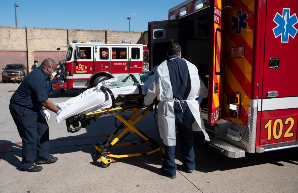 Paramedics unload a patient from an ambulance in Arlington, Virginia, on April 9, 2020. Nearly 500,000 residents have been removed from Medicaid in Virginia since the unwinding process took effect.
