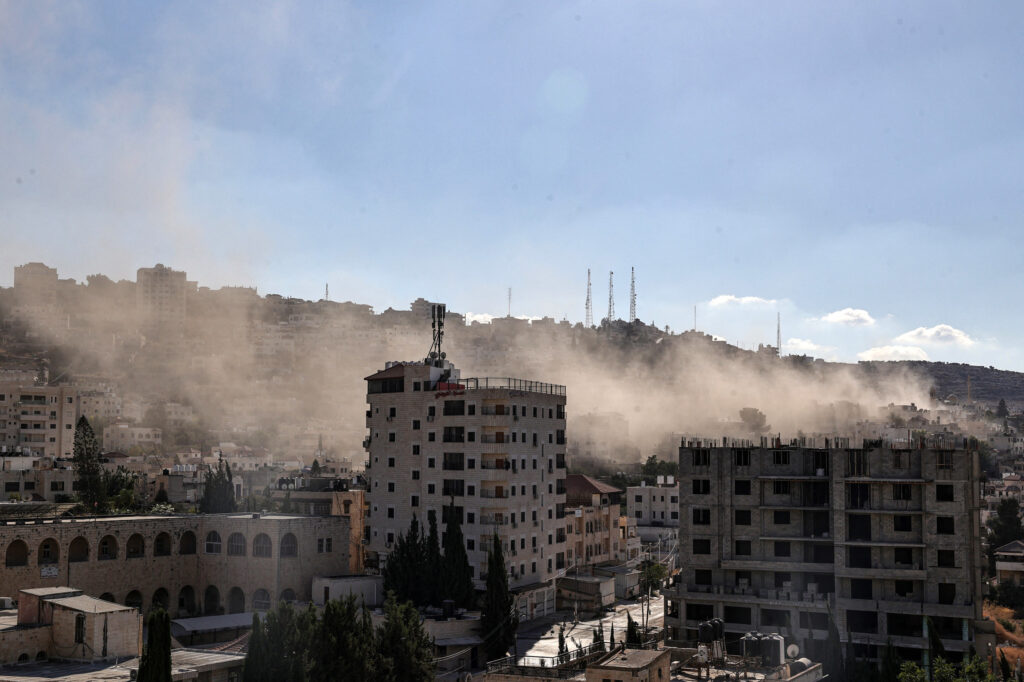 Smoke rises during an ongoing Israeli military raid in Jenin in the occupied West Bank on September 5, 2024. On Friday, two Palestinian doctors said that an American woman was fatally shot during a protest in the West Bank.