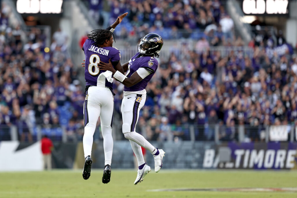 BALTIMORE, MARYLAND – NOVEMBER 05: Tyler Huntley #2 of the Baltimore Ravens celebrates after a touchdown with Lamar Jackson #8 during the second half at M&T Bank Stadium on November 05, 2023 in Baltimore, Maryland. Huntley is returning to the Ravens.