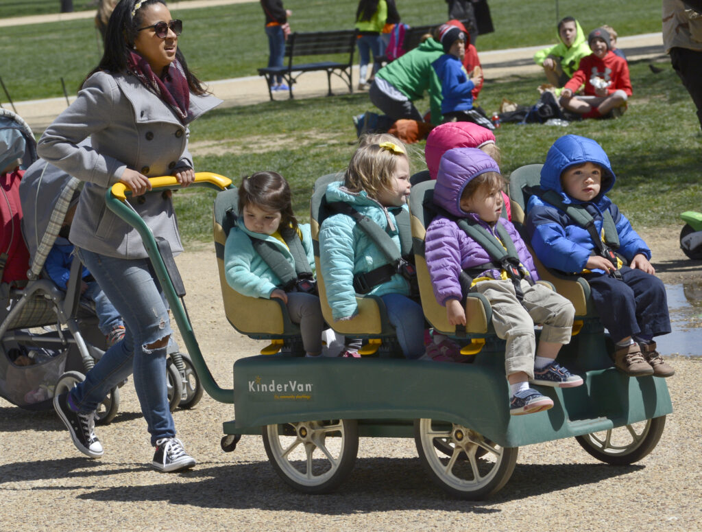 A day care center employee pushes a KinderVan filled with preschool children on an outing along the National Mall in Washington, D.C. Parents dropping out of the workforce because of child care concerns is costing Washington state residents more than $1 billion in taxes.