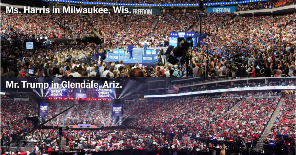 On a Tuesday night during the weeklong Democratic National Convention in late August, Ms. Harris drew 12,800 to a campaign event at the Fiserv Forum in Milwaukee, Wis. Here’s a scene from that rally: