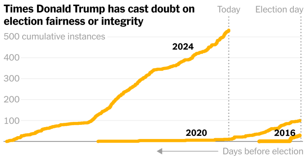 The Times has documented more than 500 campaign events, social media posts and interviews during the 2024 cycle in which Mr. Trump falsely accused Democrats or others of trying to “rig,” “cheat,” “steal” or otherwise “influence” the next election — or of having done so in 2020.
