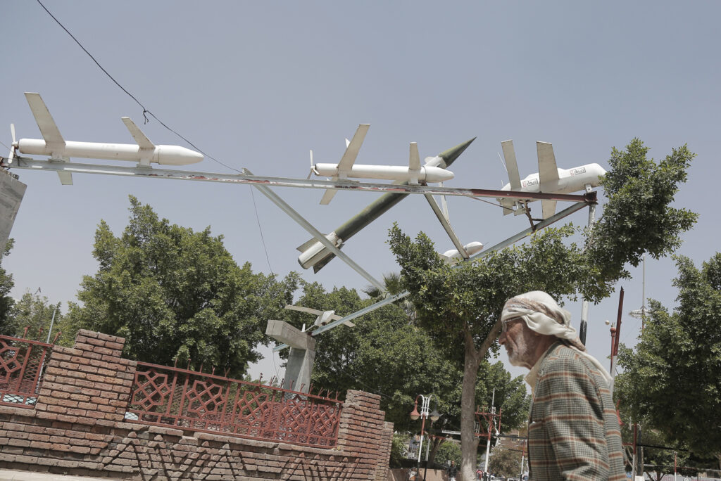 A Yemeni man walks under mock drones and missiles displayed at a square on April 25, 2024, in Sana’a, Yemen.