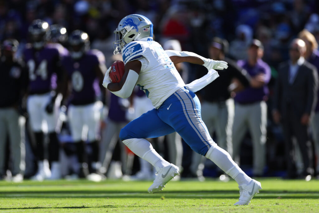 BALTIMORE, MARYLAND – OCTOBER 22: Mohamed Ibrahim #35 of the Detroit Lions carries the ball in the second half of the game against the Baltimore Ravens at M&T Bank Stadium on October 22, 2023 in Baltimore, Maryland. (Photo by Patrick Smith/Getty Images