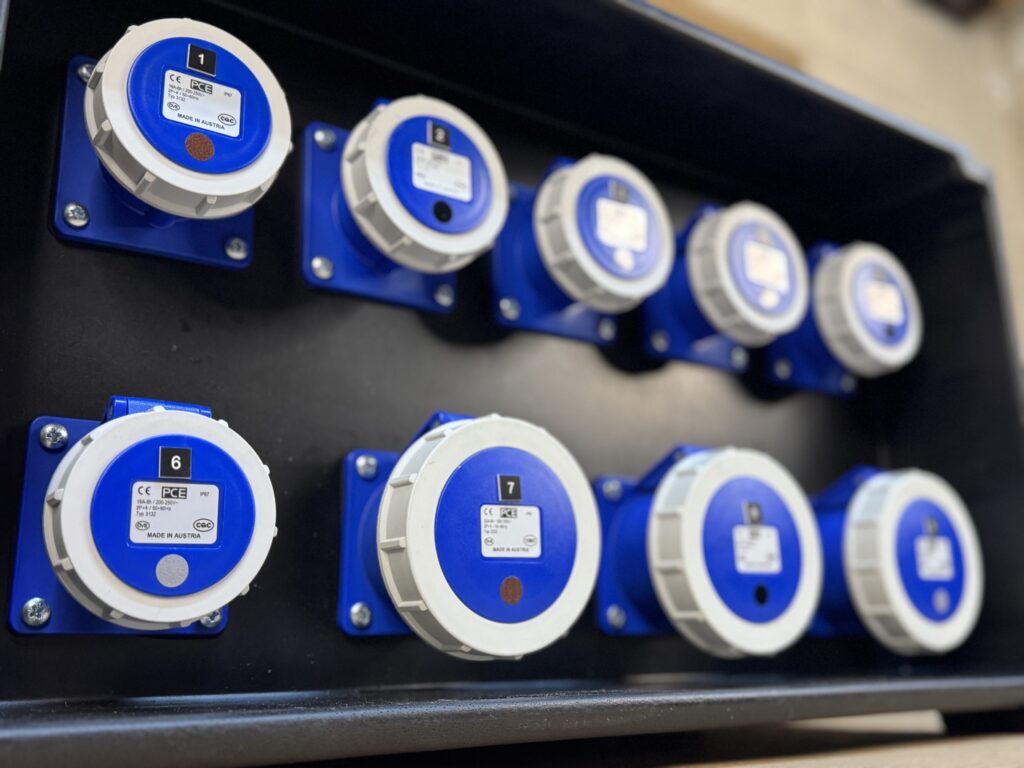 Our standard range of “distros” comes in IP44, but we can produce units with higher IP ratings, like the one highlighted here, to better handle the unpredictable UK weather. This flexibility ensures that your specific event needs are met with precision and reliability.