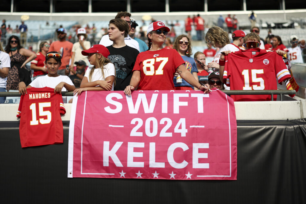 A Kansas City Chiefs fan holds a campaign sign for Taylor Swift and Travis Kelce in the stands prior to an NFL preseason football game against the Jacksonville Jaguars at EverBank Stadium on August 10, 2024 in Jacksonville, Florida. Fans are clearly rooting for a Swift-Kelce power play in the game of love.